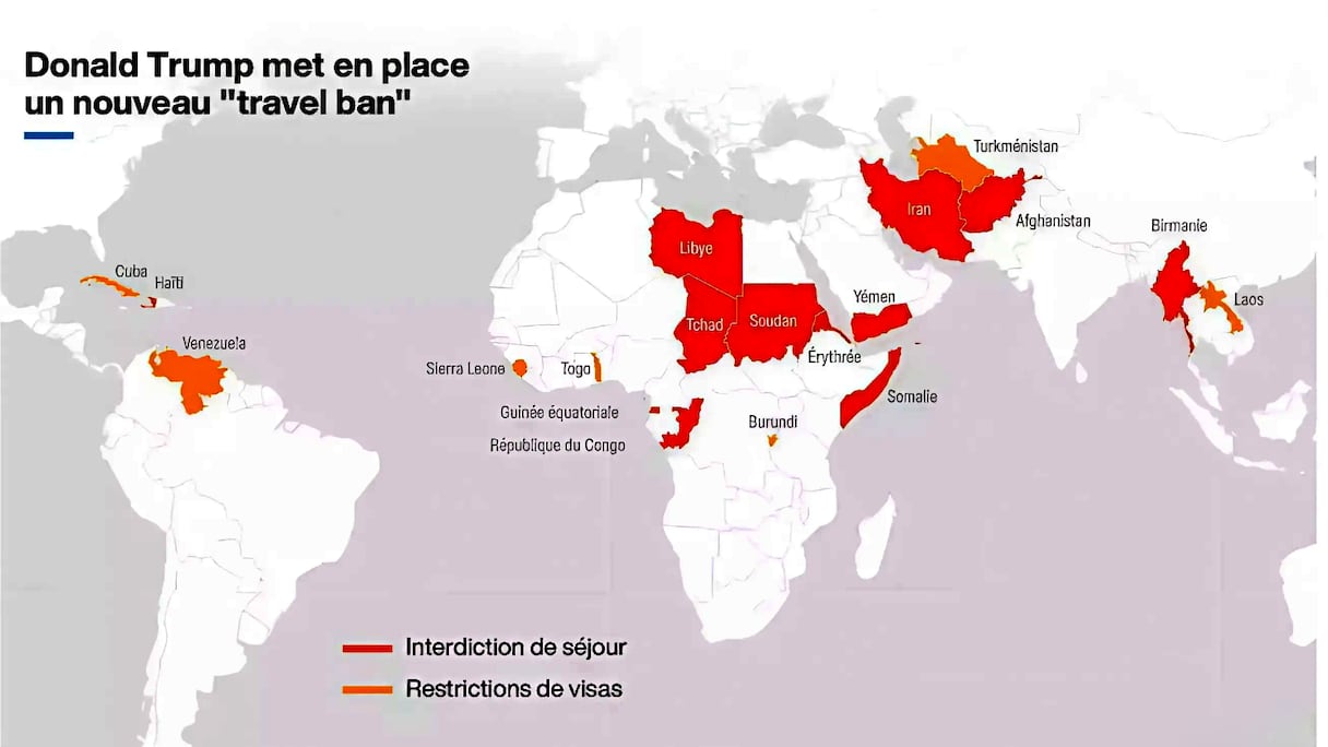 Les pays touchés depuis le 9 juin 2025 par les restrictions de voyages aux Etats-Unis. 12 pays dont 7 africains: Congo Brazzaville, Guinée équatoriale, Érythrée, Libye, Somalie, Soudan et Tchad.. DR