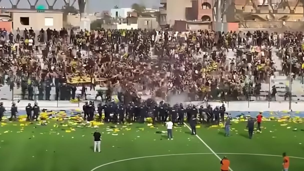 ولم ينتظر الأنصار صافرة النهاية ليعلنوا تمردهم، بل تحول الملعب الحديث إلى ساحة مواجهة مفتوحة؛ رشق خلالها المشجعون الميدان بالحجارة والقارورات واقتلعوا مئات الكراسي.