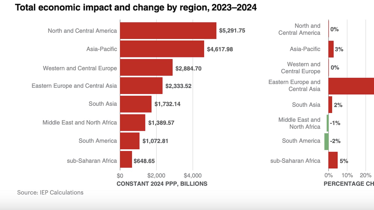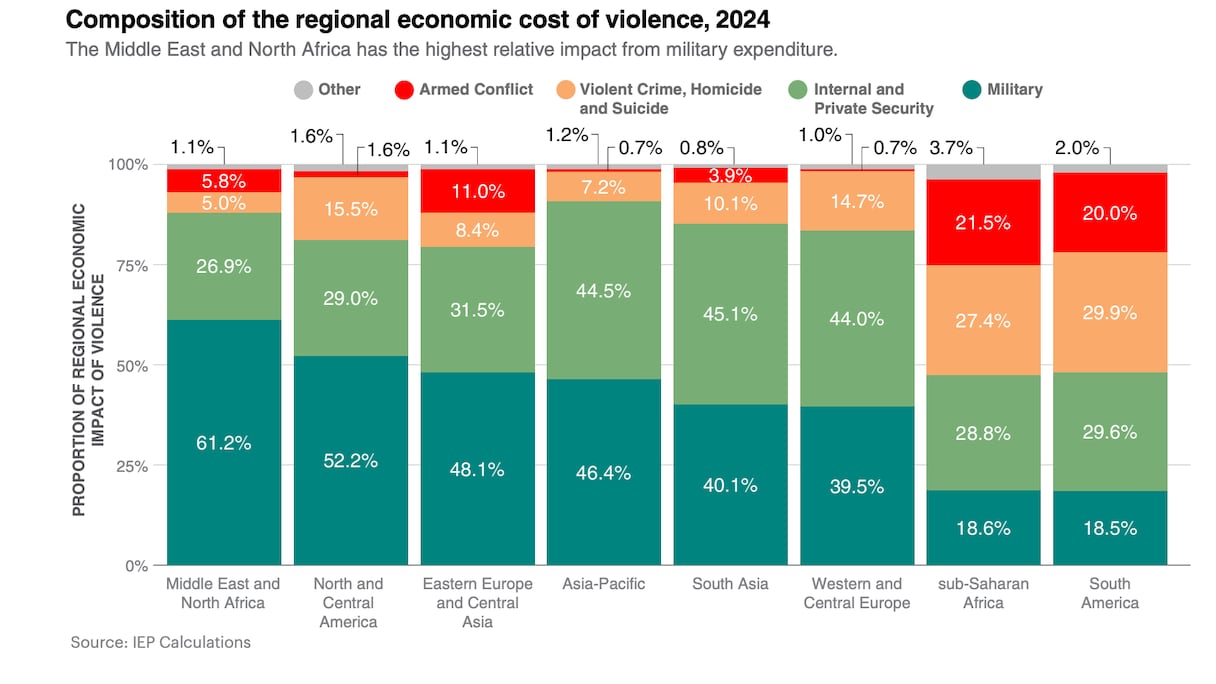 كذلك، المتوسط العام لسلم الدول قد تدهور بنسبة 0.36٪ في عام 2025 مقارنة بالعام الذي قبله. هذا الوضع يُؤدّي إلى عسكرة أكبر للدول. والعنف العالمي له تكلفة باهظة. بحسب بيانات المعهد، بلغ الأثر الاقتصادي العالمي للعنف حوالي 20 ألف مليار دولار حسب تعادل القدرة الشرائية الثابت في 2024، أي ما يُوازي 11.6٪ من الناتج المحلي الإجمالي العالمي، أو ما يعادل 2,455 دولارا للفرد الواحد.