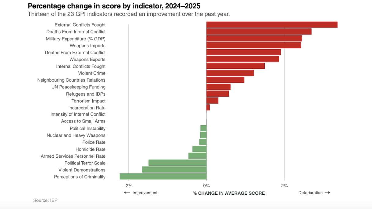 الحروب، الإرهاب، التوترات السياسية والتجارية، شدّ الرقابة على الحدود، الزيادة الكبيرة في شراء الأسلحة… كلها مؤشرات تُثبت بأن العالم أصبح أقل سلما وأمناً. هذا الوضع يظهر بوضوح في المؤشر العالمي للسلام الذي يُعدّه معهد الاقتصاد والسلام (IEP). يتبيّن أنه في عام 2025، بلغ عدد الصراعات بين الدول أعلى مستوى له منذ الحرب العالمية الثانية.