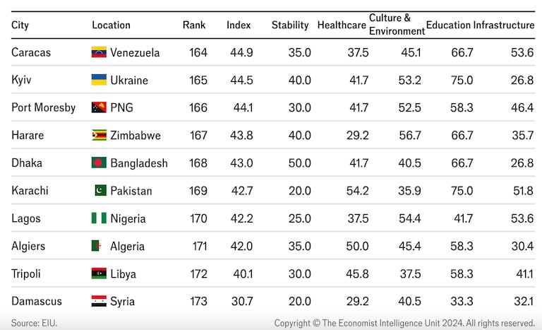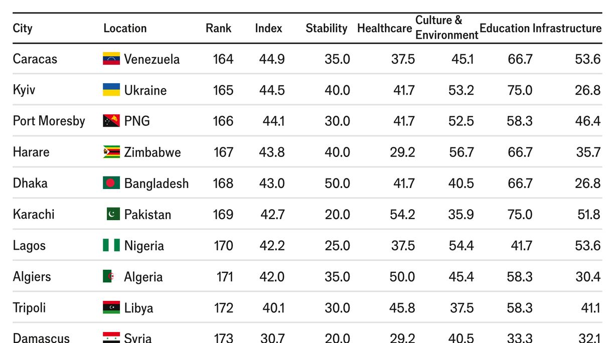 ويتعلق الأمر بطرابلس (ليبيا)، التي تحتل المرتبة 172 عالميا، وقبل الأخيرة في عالم المدن التي لا يصلح العيش فيها، خلف الجزائر العاصمة، المرتبة 170 عالميا بنتيجة 42.0/100، تليها لاغوس (نيجيريا)، وهراري (زيمبابوي).
