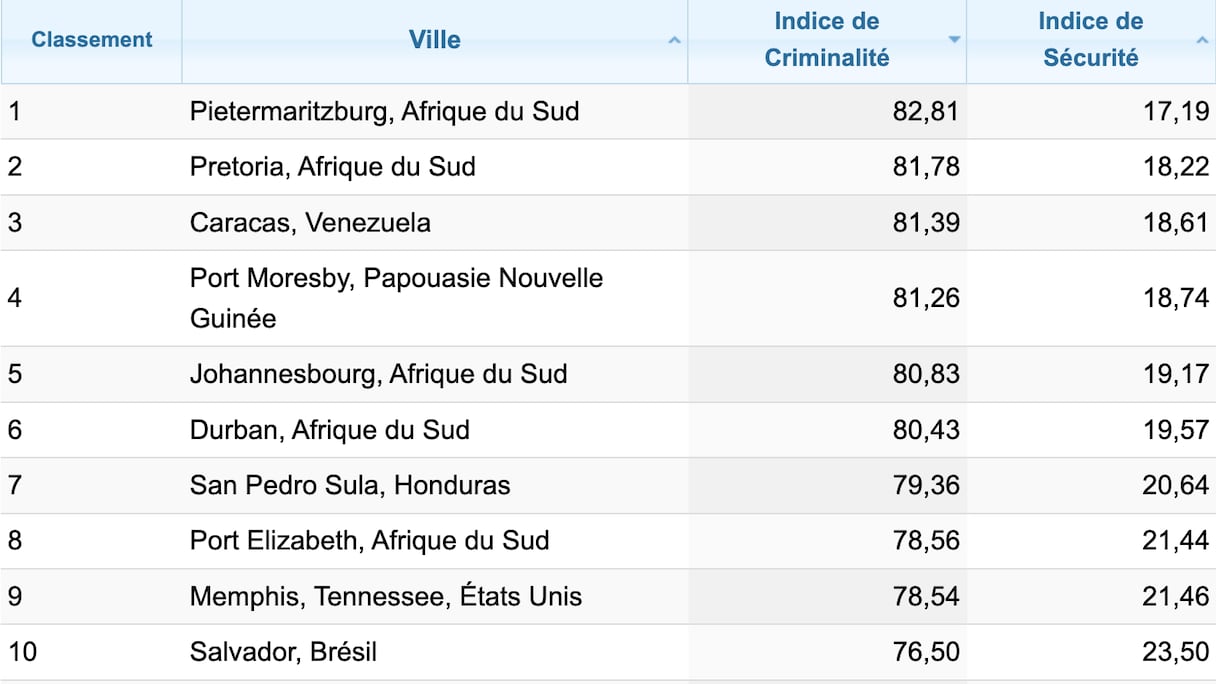 وتعتبر بيترماريتسبيرغ، عاصمة مقاطعة كوازولو ناتال، وبريتوريا من بين المدن ذات أعلى معدلات الجريمة في العالم. كما تصنف ست مدن جنوب إفريقية ضمن قائمة المدن العشرين الأكثر عنفا في العالم وفقا لمؤشر الجريمة لعام 2026. وهو ما يؤشر على مستوى العنف في بلد لا تزال فيه أوجه عدم المساواة الناجمة عن نظام الفصل العنصري واضحة، بعد مرور أكثر من 30 عاما على انتهائه. السرقة والقتل والاغتصاب والاعتداء... تشكل الواقع المعيشي لساكنة البلاد.