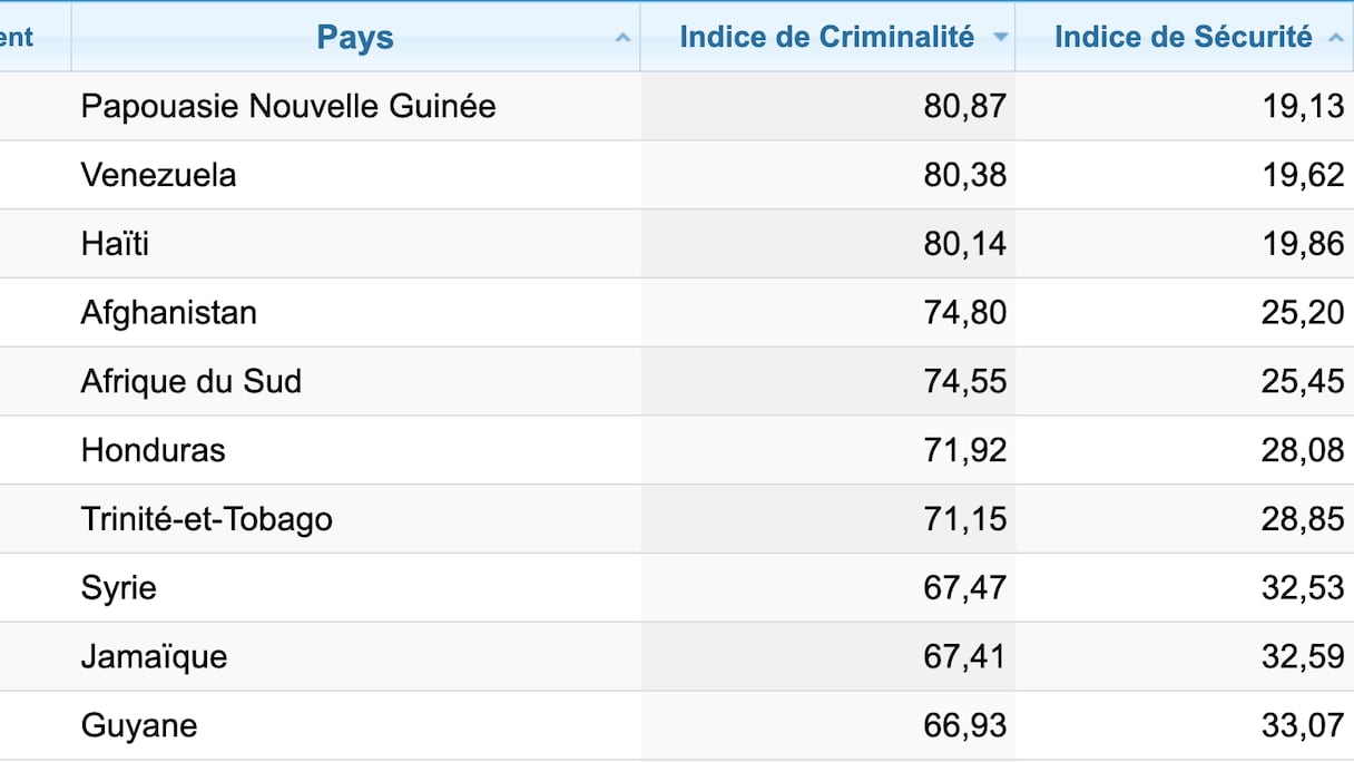 تتقدم بابوا غينيا الجديدة على هذا البلد عالميا بمعدل جريمة يبلغ 80.87 ومؤشر أمني يبلغ 19.13، مما يجعله أكثر البلدان عنفا في العالم، متقدما على فنزويلا (80.38 و19.62)، وهايتي (80.14 و19.86)، وأفغانستان (74.55 و25.45).