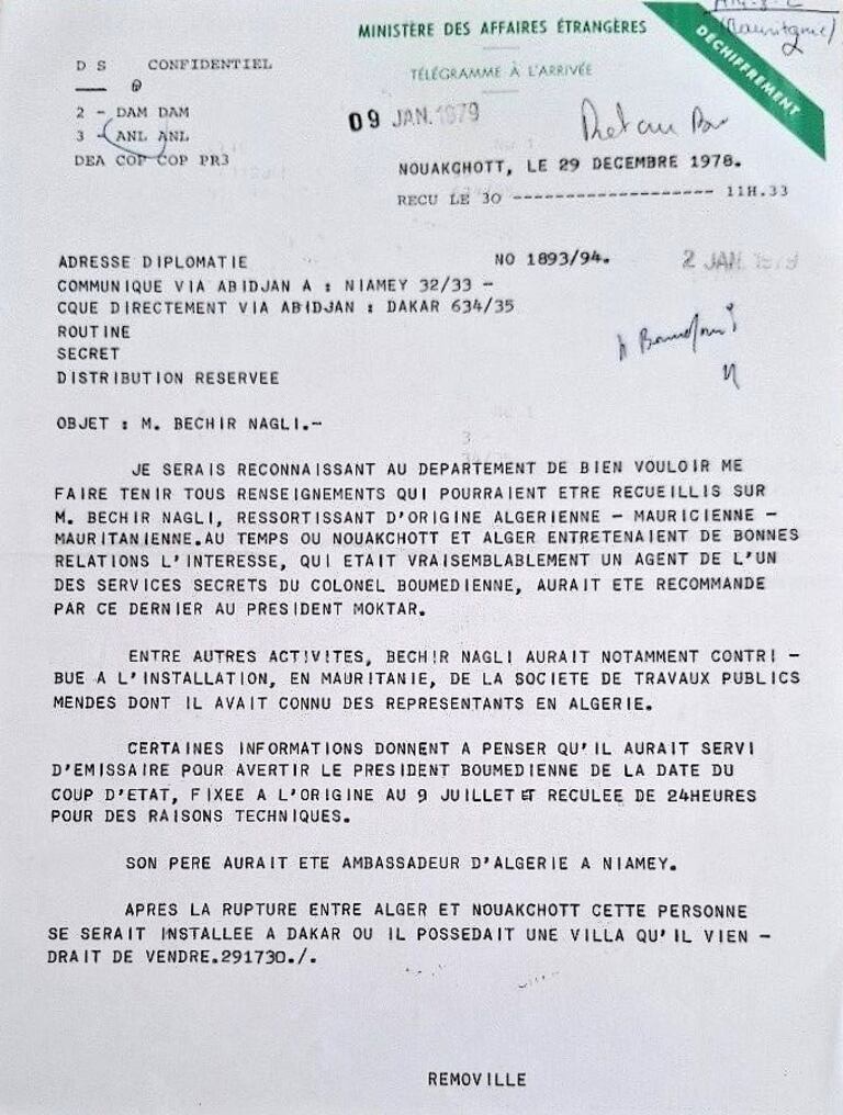 تكشف برقية سرية مؤرخة في 29 دجنبر 1978 أن بشير نيغلي، الشخصية المحورية في الأوساط الاقتصادية والسياسية الجزائرية، لعب دورا حاسما في تحديد موعد الانقلاب بإبلاغه الرئيس بومدين مباشرة بالعمل العسكري الوشيك. وكان نيغلي، نجل سفير سابق في النيجر، قد أقام علاقات قوية في داكار، حيث استقر بعد القطيعة الدبلوماسية بين نواكشوط والجزائر عام 1975.