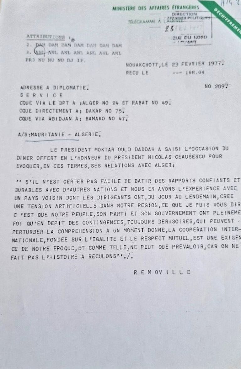 وفقا لبرقية دبلوماسية مؤرخة في 23 فبراير 1977، أرسلها السفير الفرنسي ريموفيل (Removille) من نواكشوط، استغل الرئيس المختار ولد داداه حفل عشاء أُقيم على شرف الرئيس نيكولاي تشاوشيسكو لتوضيح رؤيته للعلاقات الدولية، وخاصة مع الجزائر. وصرح حينها قائلا: