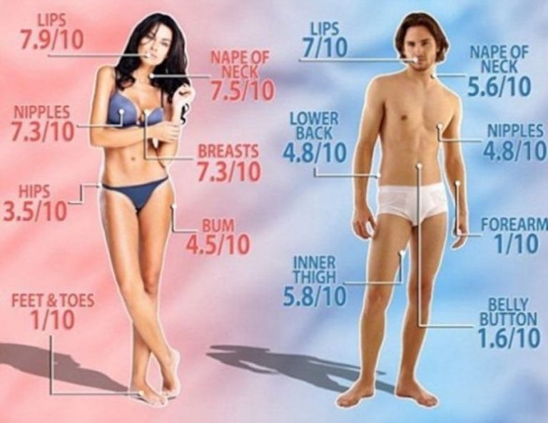 وفي لائحة أكثر أعضاء جسد المرأة إثارة للشهوة الجنسية، نجد أن الفم والشفتين يحتلان المرتبة الأولى بنسبة 7.9 من أصل 10، في حين جاءت منطقة مؤخرة العنق في المرتبة الثانية بنسبة 7.5 من أصل 10. واحتل الثديين المرتبة الثالثة بنسبة 7.3، في حين حصل الوركان على 3.5، والقدمان على 1 من 10.