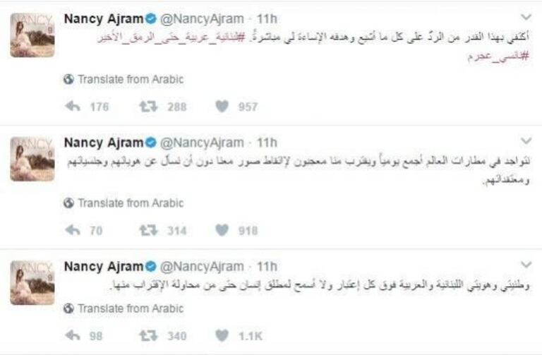 وفي تغريدة لها عبر حسابها الخاص على تويتر كتبت عجرم: "وطنيتي وهويتي اللبنانية والعربية فوق كل إعتبار ولا أسمح لمطلق إنسان حتى من محاولة الإقتراب منها، نتواجد في مطارات العالم أجمع يومياً ويقترب منّا معجبون لإلتقاط صور معنا من دون أن نسأل عن هوياتهم وجنسياتهم ومعتقداتهم، أكتفي بهذا القدر من الردّ على كل ما أشيع وهدفه الإساءة لي مباشرةً".