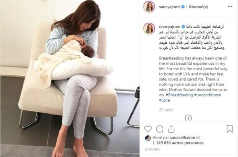 وأرفقت نانسي الصورة التي انتشرت بشكل كبير عبر مواقع التواصل الاجتماعي بهذه التدوينة: " الرضاعة الطبيعية كانت دائمًا من أجمل التجارب في حياتي، بالنسبة لي، هي الطريقة الأقوى للتواصل مع "لِيا"، تجعلها تشعر بالأمان والحب والاهتمام، ليس هناك شيء طبيعي وصحيح أكثر مما خططت الطبيعة الأم لأن نقوم به".