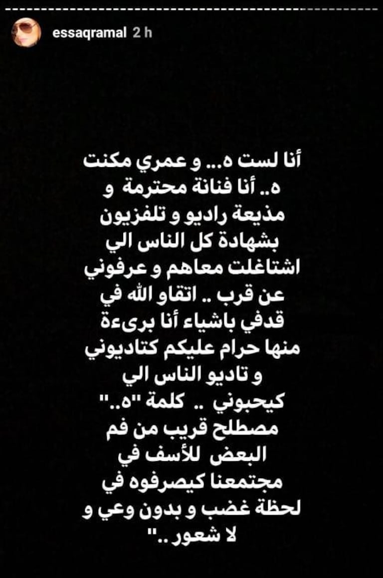 وقالت أمل صقر في سلسلة تدوينات لها عبر خاصية الستوري بمنصة الانستغرام، إنها إعلامية وفنانة محترمة تحترم زملاءها بشهادة كل من اشتغل معها، مضيفة أنها ليست "ه..".