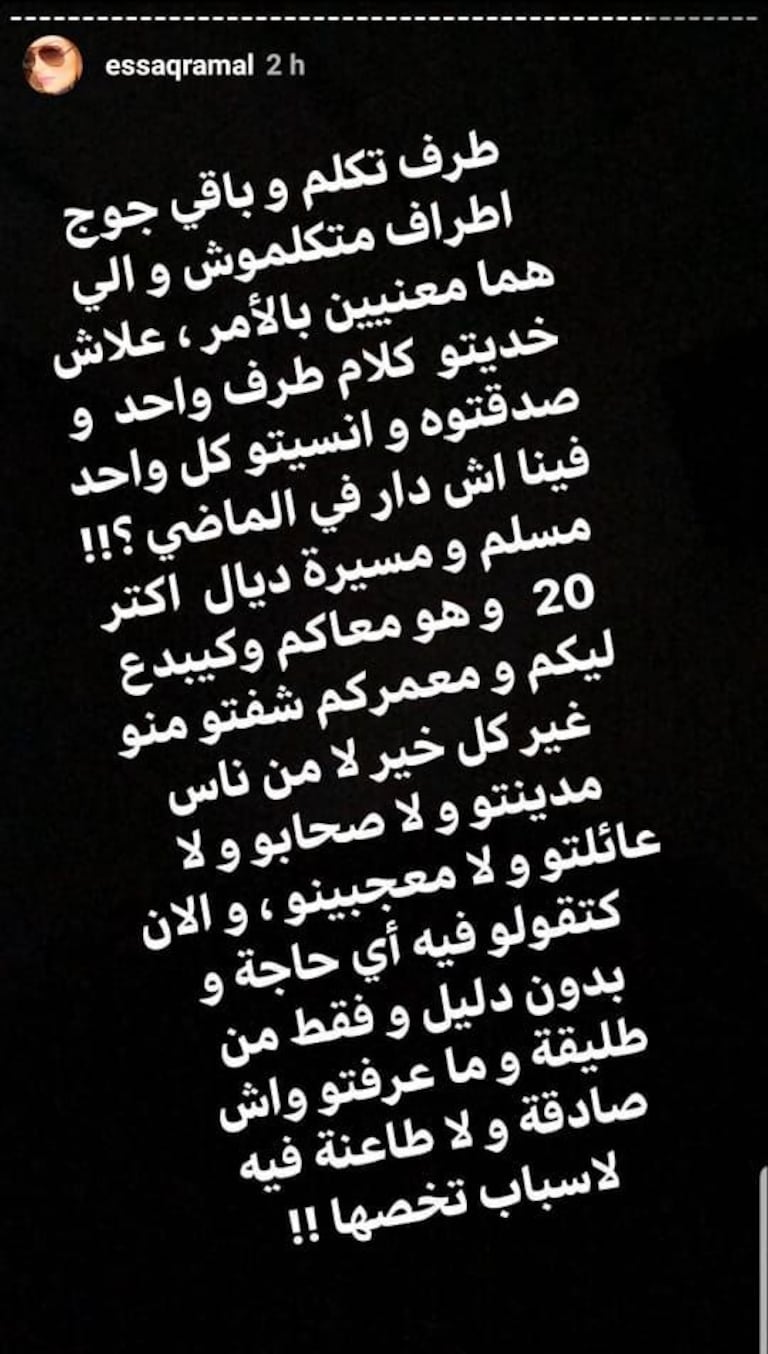 وأضافت المتحدثة في خطاب تؤنب فيه من اتهمها بالخيانة، "اتقوا الله في قذفي بأشياء أنا بريئة منها حرام عليكم كتآذيوني وتآذيو الناس لي كيحبوني"، مشيرة إلى أن "كلمة "ه.." مصطلح قريب من فم البعض للأسف في مجتمعنا كيصرفوه في لحظة غضب بدون وعي ولا شعور".