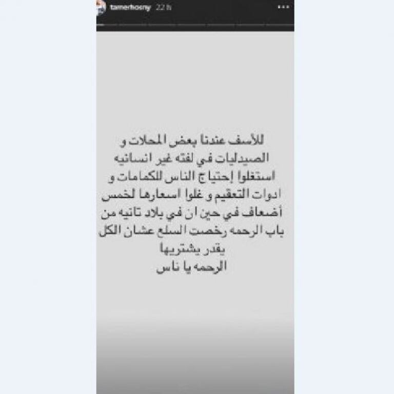 وقال تامر في تدوينته: "لأسف عندنا بعض المحلات والصيدليات في لفتة غير إنسانية استغلوا احتياج الناس للكمامات وأدوات التعقيم وغلو أسعارها لخمس أضعاف".