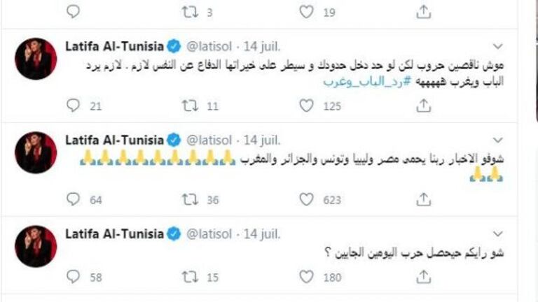 وقالت لطيفة في تغريدتها: “شوفوا الأخبار، ربنا يحمي مصر وليبيا وتونس والجزائر والمغرب”.