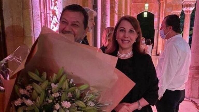 وظهر برفقة ماجدة الرومي شقيقها عوض الرومي، حاملا معه باقة من الورد، كهدية للرئيس الفرنسي.
