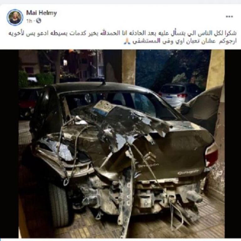 وحرصت مي على طمأنة متابعيها على الفيسبوك، فنشرت صورة لسيارتها المحطمة، وأرفقتها بهذه التدوينة: " أشكر كل الناس الذين سألوا عني بعد تعرضي للحادثة، أنا الحمد لله بخير، أصبت ببعض الكدمات البسيطة، ولكن شقيقي متعب جدا، فأرجوا أن تقوموا بالدعاء له".