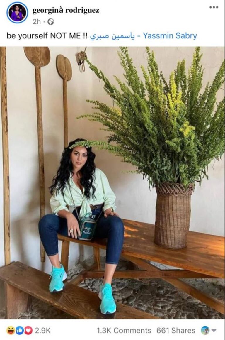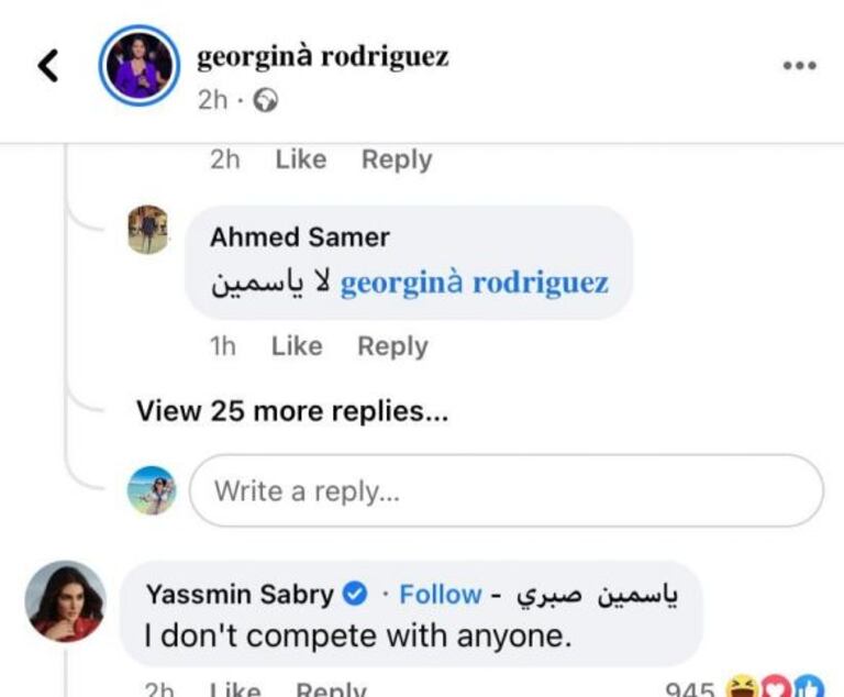 وتلك الصفحة التي علّقت على الحساب المنسوب لعارضة الأزياء، قائلين بالإنجليزية: «أنا لا أتنافس مع أي شخص»، وتلك العبارة كانت ردًا على صفحة جورجينا المنسوبة لها عبر «فيسبوك»، بعدما وجهت رسالة زائفة مباشرة لياسمين صبري قائلة لها: «كوني نفسك وليس أنا».