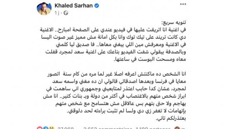 ونشر سرحان تدوينة طويلة اعتذر فيها من جمهوره، لأنه قام بنشر مقطع من أغنية "من أول دقيقة" لإليسا ولمجرد، مؤكدا أنه لم يكن يعلم أن سعد هو الذي يشاركها الغناء.
