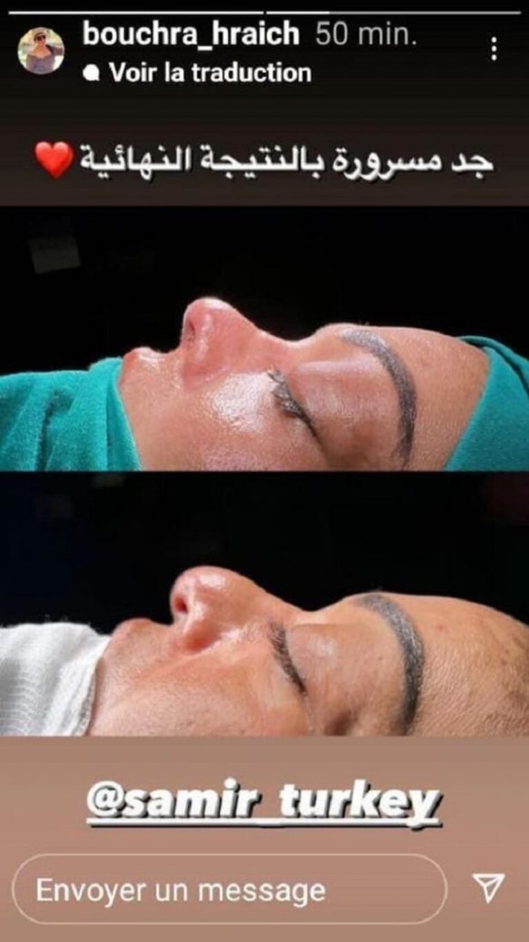ونشرت بشرى عبر ستوري حسابها على الانستغرام، صورتها من داخل غرفة العمليات والتي تظهر النتيجة النهائية لعملية تجميل أنفها.