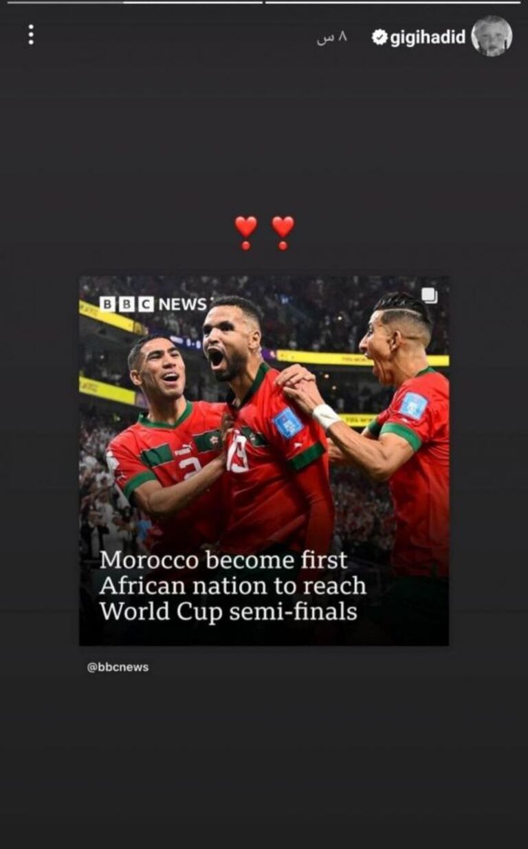 جيجي حديد نشرت عبر خاصية الستوري على حسابها على إنستغرام صورة للمنتخب المغربي أثناء الاحتفال وكتبت: "أصبح المغرب هو أول دولة إفريقية تصل إلى نصف نهائي كأس العالم".
