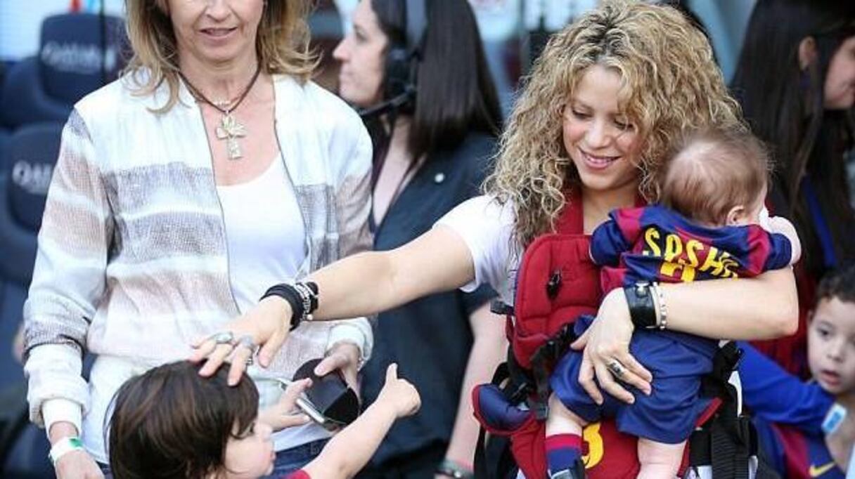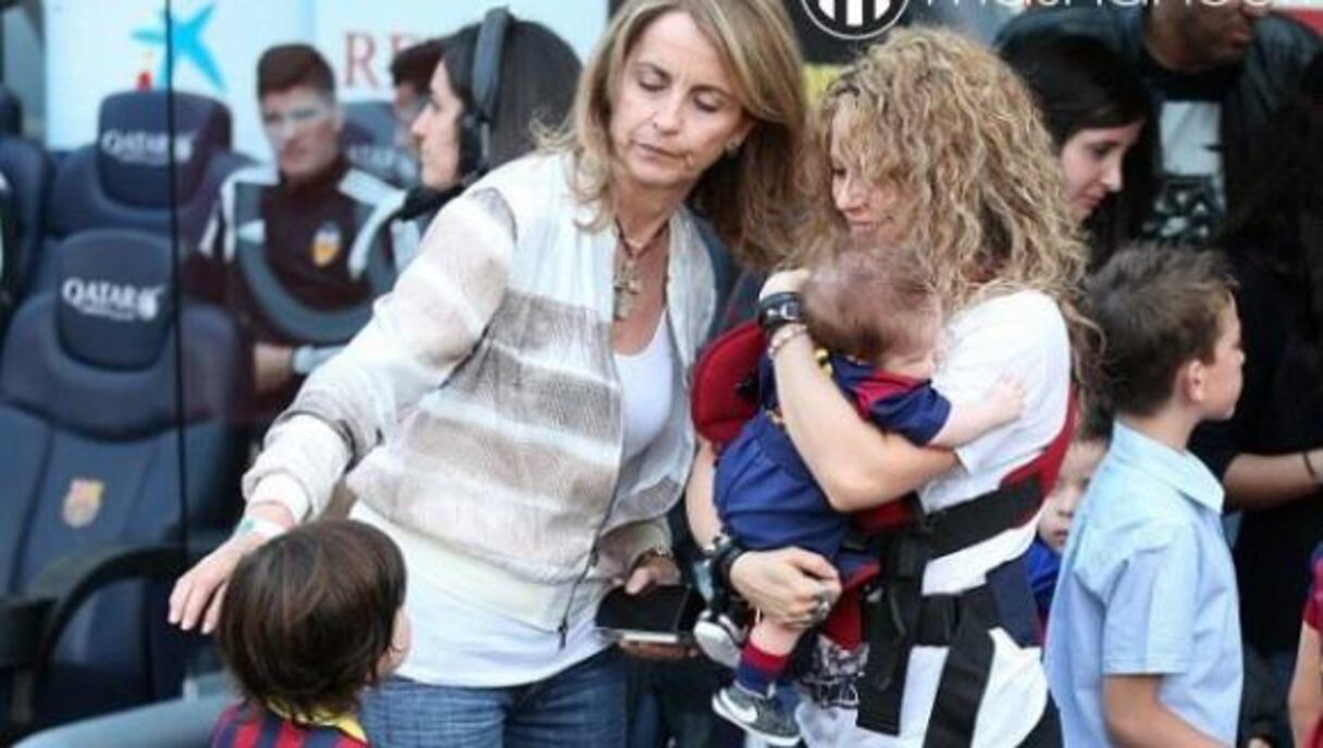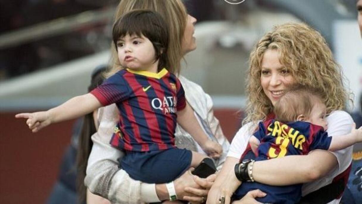 وكانت نجمة البوب الأم البالغة من العمر 38 عام تحتضن طفلها الرضيع "ساشا" وهي تجلس في المدرجات الأمامية رفقة حماتها بينما ألبست الطفلين القمصان الخاصة بنادي برشلونة.