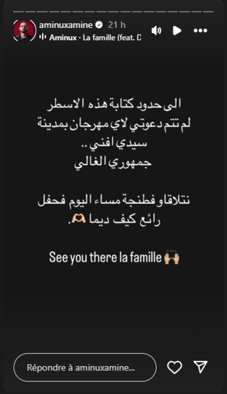 وأوضح أمينوكس في تدوينة نشرها عبر ستوري حسابه على الإنستغرام، أنه لم يتلق أي دعوة للمشاركة في مهرجان بمدينة سيدي إفني، قائلا: « إلى حدود كتابة هذه الأسطر، لم تتم دعوتي لأي مهرجان بمدينة سيدي إفني ».