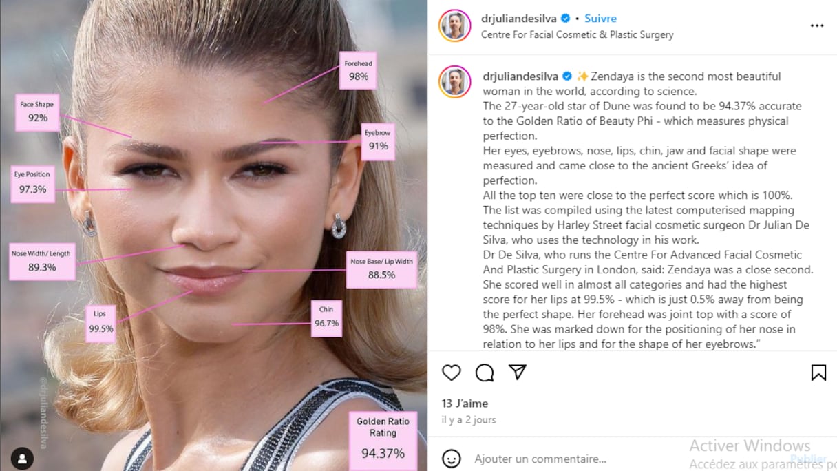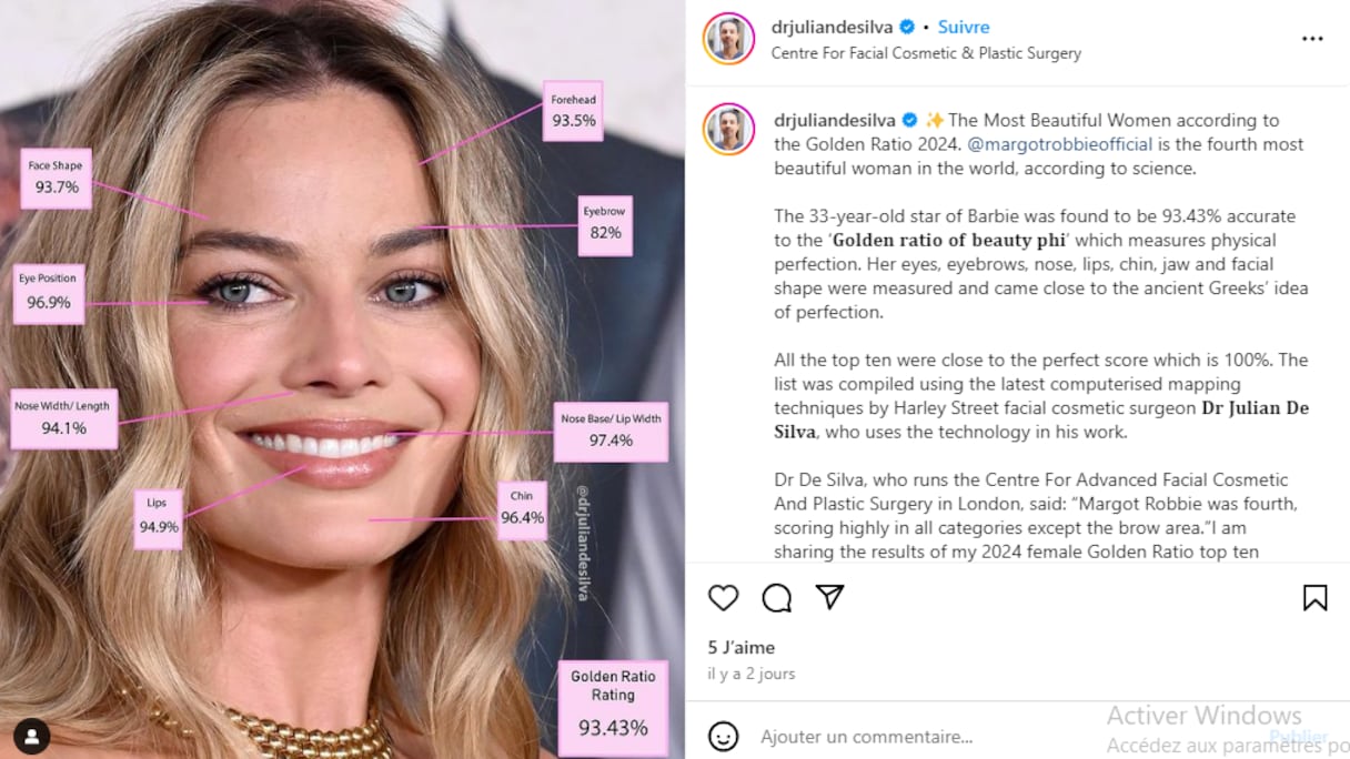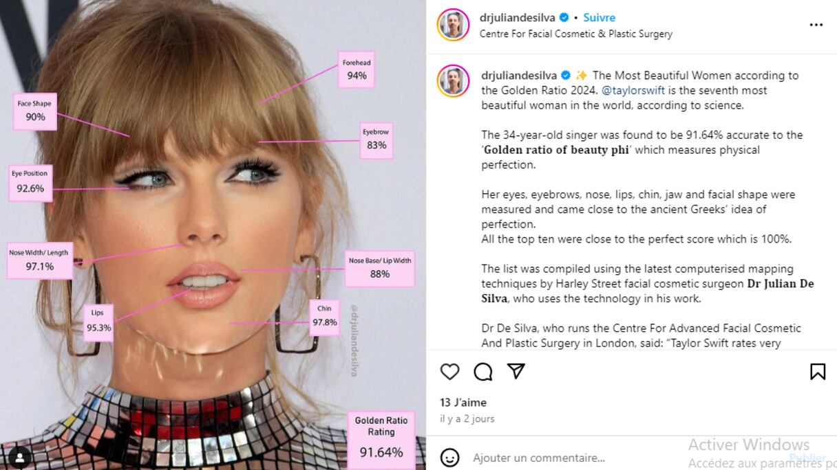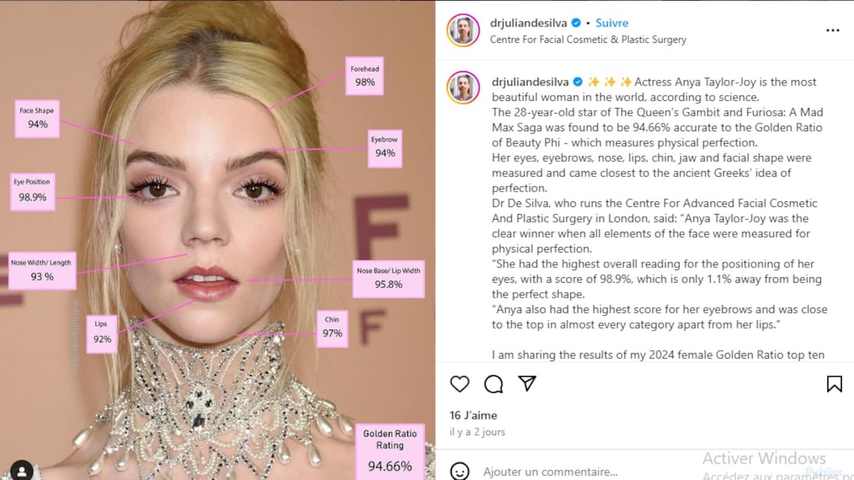 وشرح الدكتور دي سيلفا قائلا: « كانت أنيا تايلور-جوي الأبرز عند قياس جميع عناصر الوجه من حيث الكمال الجسدي. فقد حصلت على أعلى قراءة لموضع عينيها بنسبة 98.9%، وهو ما يقترب بنسبة 1.1% فقط من الشكل المثالي.