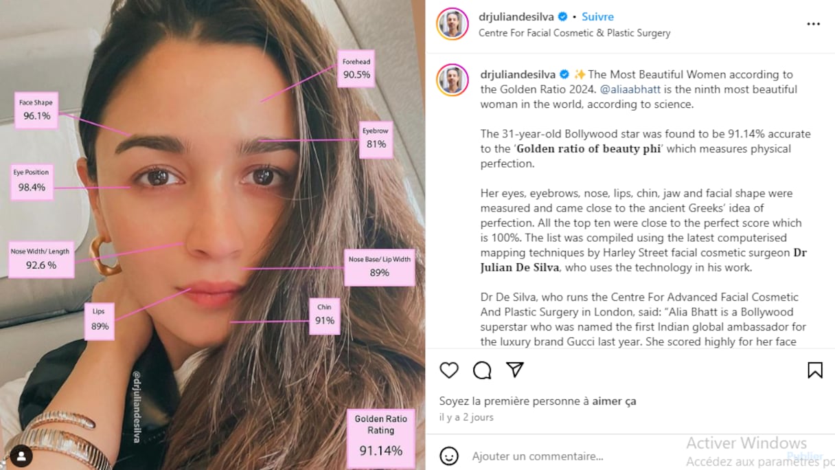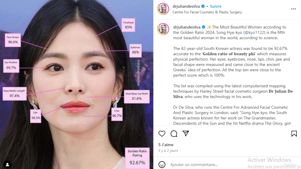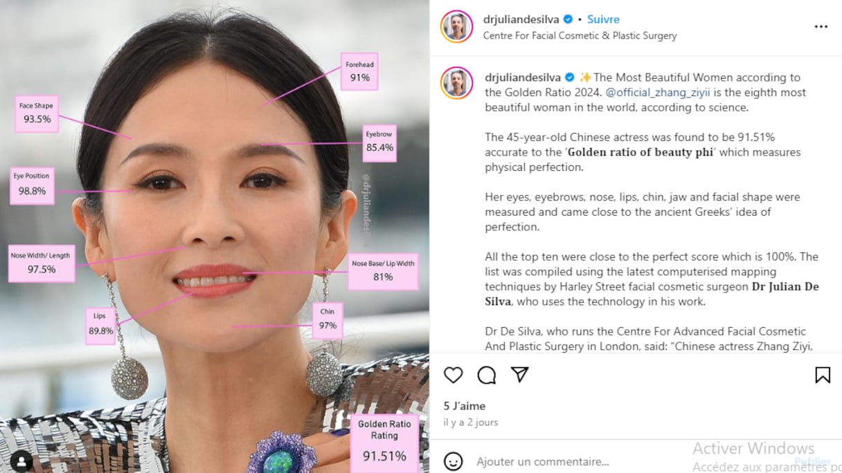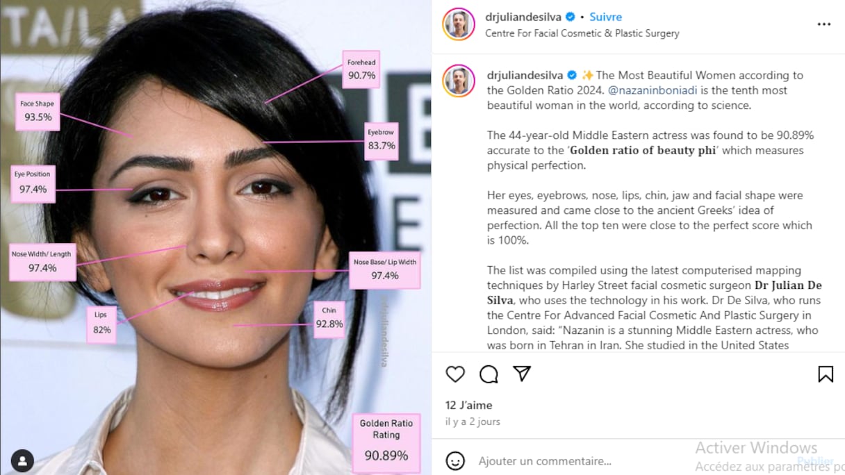 وشرح الدكتور دي سيلفا قائلا: « كانت أنيا تايلور-جوي الأبرز عند قياس جميع عناصر الوجه من حيث الكمال الجسدي. فقد حصلت على أعلى قراءة لموضع عينيها بنسبة 98.9%، وهو ما يقترب بنسبة 1.1% فقط من الشكل المثالي.