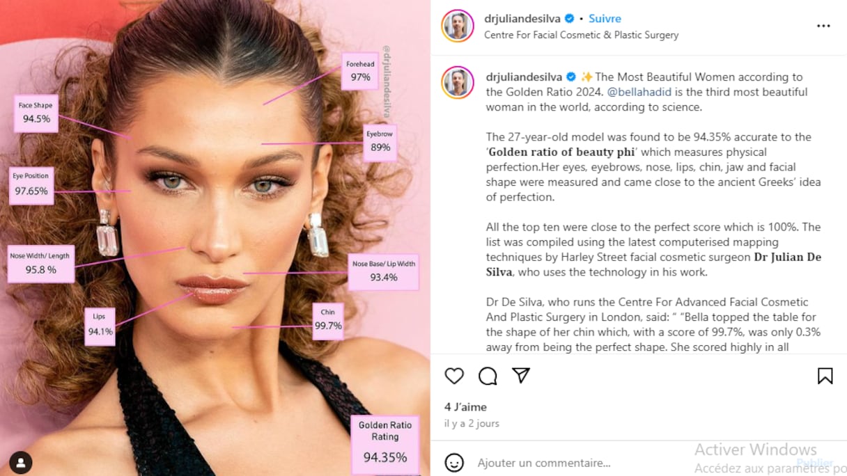 بينما جاءت بيلا حديد في المركز الثالث محققة أعلى درجة لذقنها ودرجات عالية في معظم ملامح الوجه عدا منطقة الحواجب.
