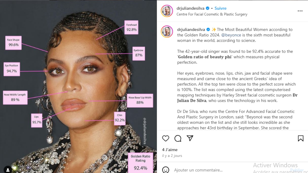 ورغم أن بيونسيه احتلت المركز السادس في قائمة أجمل النساء، إلا أنها كانت تمتلك شكل وجه قريب من المثالية، محققة نسبة 99.6%.
