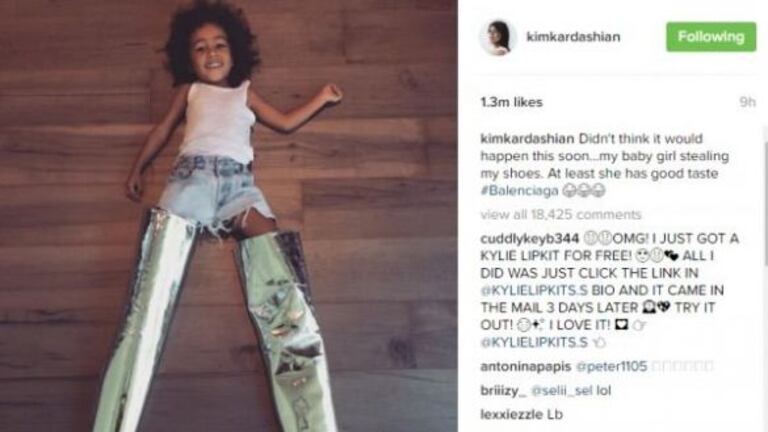 وعلّقت كيم على الصورة قائلة: “لم أكن أعتقد أن هذا سيحدث، ابنتي سرقت حذائي، ولكن على الأقل لديها ذوق سليم”، كما أعادت والدتها كريس جينر نشر الصورة نفسها على صفحاتها على مواقع التواصل الاجتماعي؟
