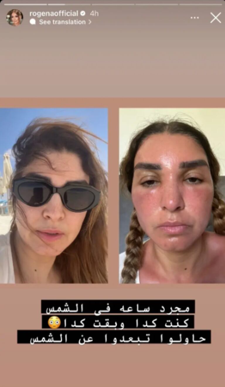 ووجهت روجينا نصيحة لجمهورها بالحذر من أشعة الشمس، خاصة خلال فصل الصيف. وكانت الفنانة قد نشرت صوراً لها على إنستغرام، ظهرت فيها بوجه منتفخ ومتورم، وكتبت في منشورها: « الحمد لله، هذا العيد... احترقت في الشمس، وأقضي العيد مع الطبيب عبر الهاتف ». وحذرت متابعيها قائلة: « مجرد ساعة في الشمس جعلتني هكذا... حاولوا تجنب الشمس ».