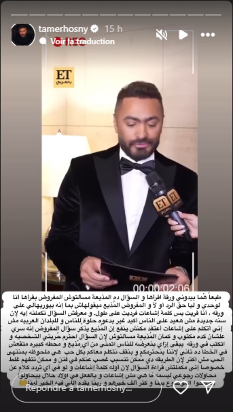 وليوضح موقفه، نشر تامر يوم الجمعة 3 يناير 2025، تدوينة مطولة عبر حسابه على الانستغرام، جاء فيها: « كان من المفترض أن أقرأ السؤال بنفسي وأختار الرد عليه أو الامتناع عنه، لأن السؤال كان مكتوبا بشكل سري على الورقة، إلا أنني فوجئت بظهوره في الفيديو بعد التوضيب، على الرغم من أن المذيعة لم تطرحه بصوت عال احتراما لخصوصيتي ».