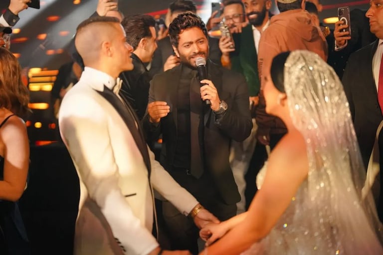 هذا، وقد أحيى حفل الزفاف، كل من الفنان مصطفى قمر، وتامر حسني، حيث قدما معا أغنية «السود عيونه»، وسط تفاعل كبير من الحضور.