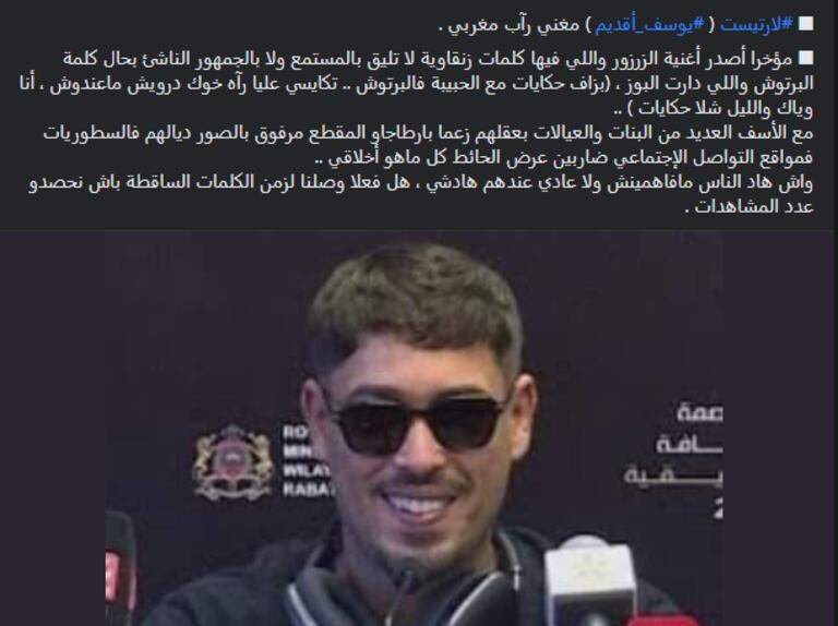 وتابع في تصريح لـle360: «وطالما أنه يتم إصدار العمل على اليوتيوب فبالطبع لكل منا الحرية في الاستماع إليه أم لا، ولكن بالمقابل عندما يصبح العمل موجها للمحطات الإذاعية أو التلفزيونية، في هذه الحالة لا يمكن أن تنطبق شروط اليوتيوب على الإذاعات والقنوات التلفزيونية، لأن هذه الأخيرة تخضع للرقابة، ولا يمكنها أن تقدم محتوى لا يليق بالجمهور الناشئ».