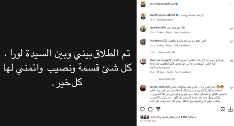 فاجأ شريف منير الجميع بإعلان طلاقه، حيث قال في منشور عبر حسابه على إنستغرام: «تم الطلاق بيني وبين السيدة لورا، كل شيء قسمة ونصيب وأتمنى لها كل الخير».