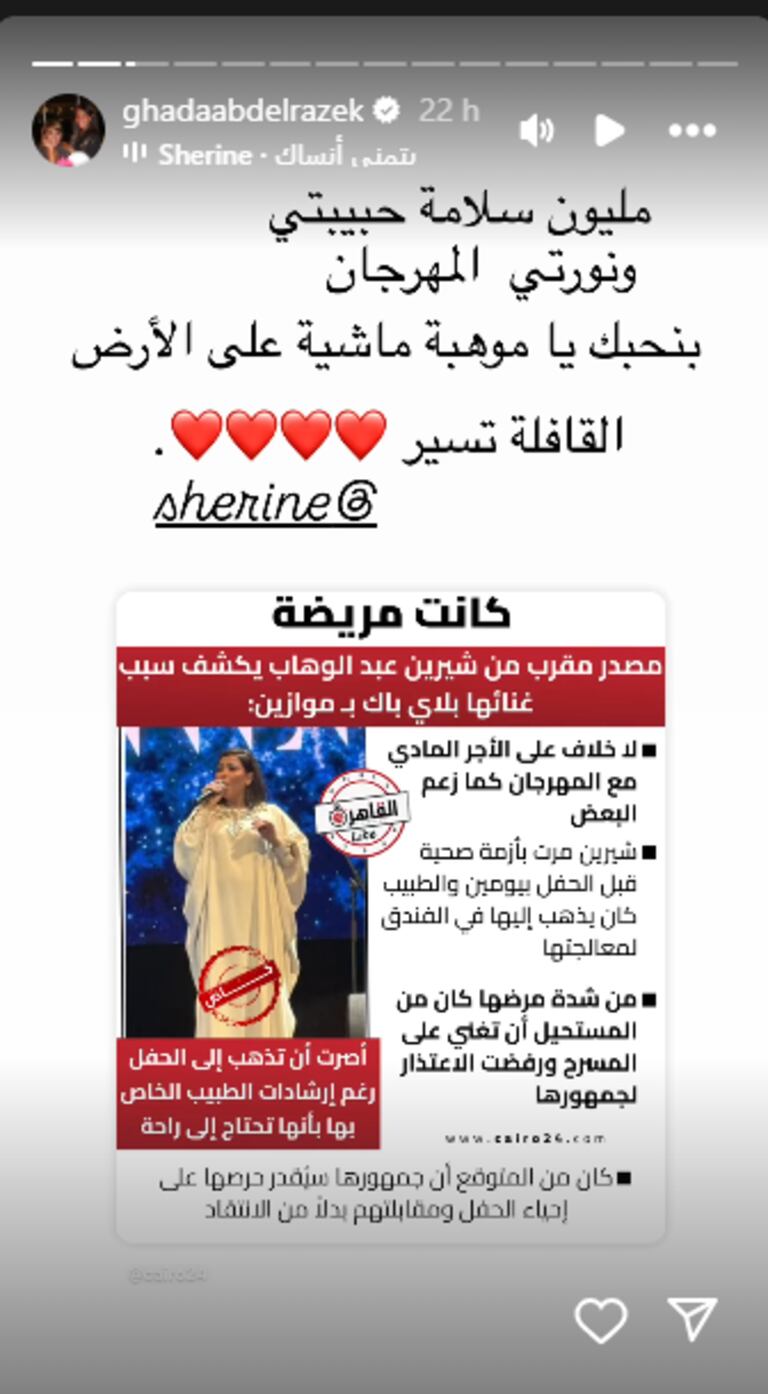 من جهة أخرى، اختار بعض الفنانين التعبير عن تضامنهم مع شيرين، من بينهم الممثلة المصرية غادة عبد الرازق التي نشرت تدوينة عبر ستوري حسابها على الإنستغرام قالت فيها: « مليون سلامة حبيبتي... القافلة تسير ».