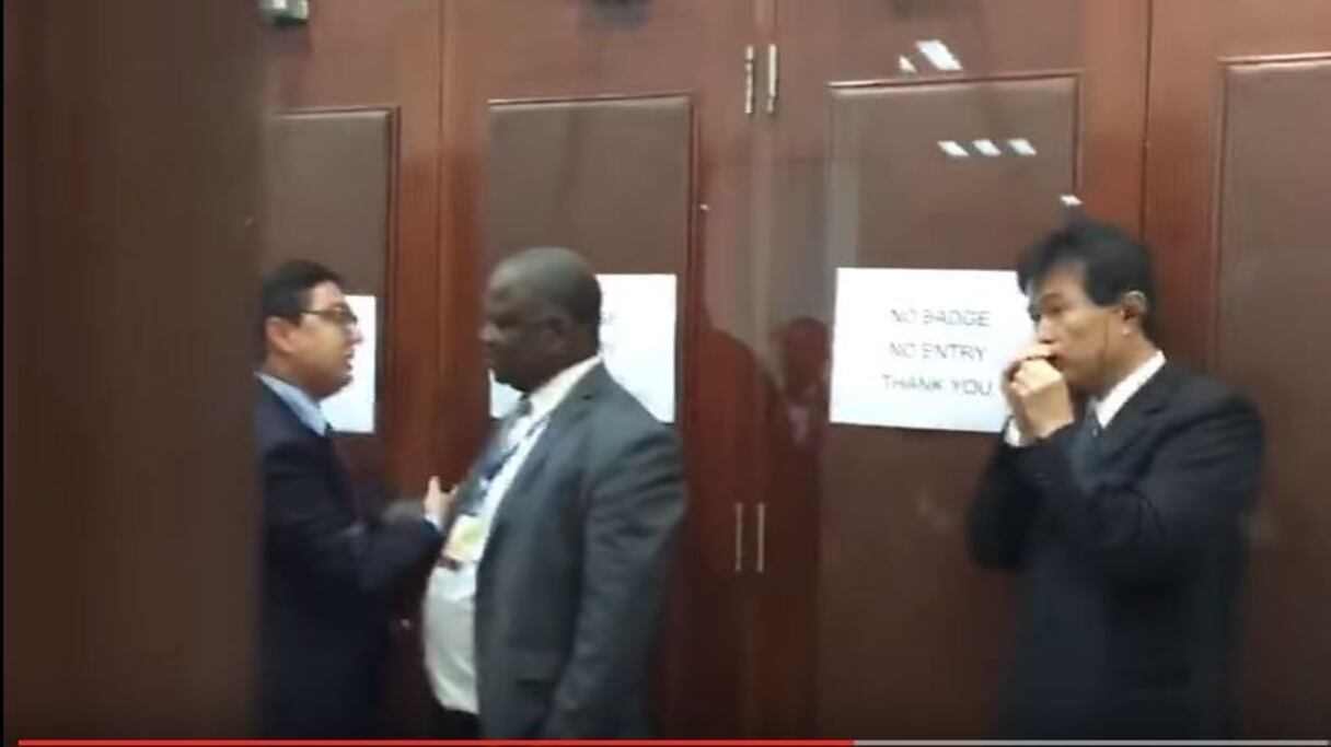 وحاول حراس الأمن منع بوريطة من دخول قاعة الاجتماع، في تناف تام مع قواعد احتضام المؤتمرات متعددة الأطراف، كما يظهر الفيديو.