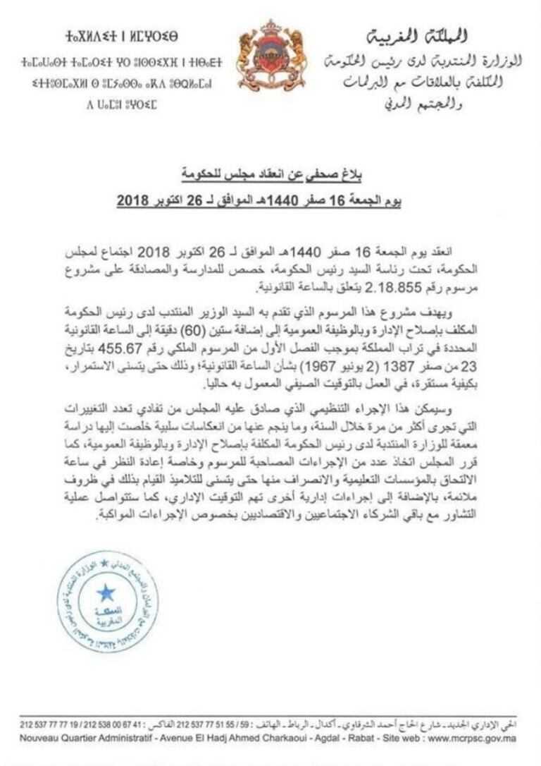 وأكد ذات المصدر على عزم حكومة سعد الدين العثماني، أيضا، على "اتخاذ إجراءات إدارية أخرى تهم التوقيت الإداري".