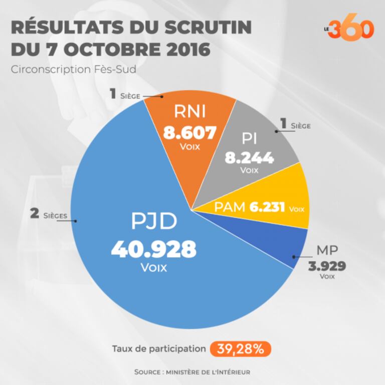 دائرة فاس-الجنوبية: هذا مثال على دائرة انتخابية من المحتمل جدا أن يخسر فيها حزب العدالة والتنمية مقعدا. منذ عام 2011، اعتاد الحزب ذي المرجعية الإسلامية على الفوز بمقعدين برلمانيين فيها من أصل أربعة. فسيكتفي فقط خلال هذه الانتخابات التشريعية ليوم 8 شتنبر على مقعد برلماني واحد. سنقدم فيما يلي عملية حسابية.