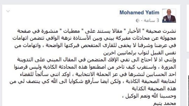 وكتبت يتيم عبر صفحته على فيسبوك «انتقلوا إلى المس في أعراضنا والمس في شرفنا وشرف المحصنات بيننا وبينهم القضاء »، وتابع في تدوينة أخرى «نشرت صحيفة "الأخبار" مقالا يستند على "معطيات" منشورة في صفحة مجهولة عن محادثات مفبركة بيني وبين الأستاذة نزهة الوافي تتضمن اتهامات في عرضنا وشرفنا لا يخفى للقارء المتفحص فبركتها الواضحة، واتهامات من نفس القبيل لنواب برلمانيين آخرين».
