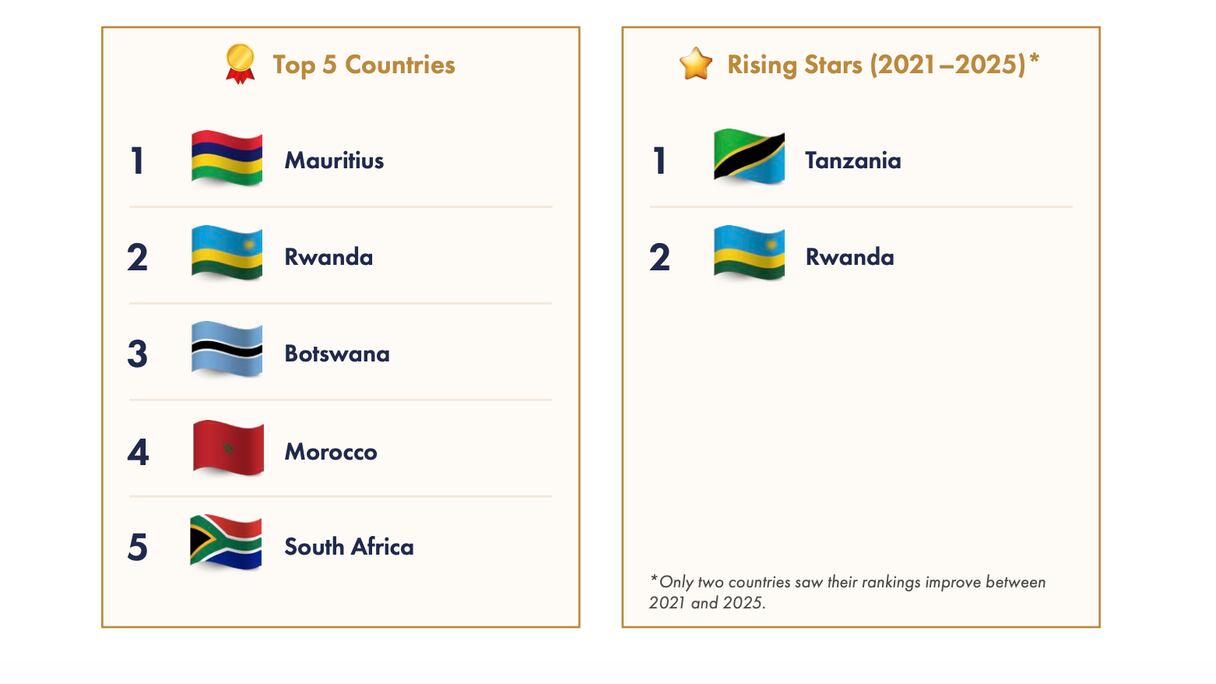 بعد موريشيوس، جاءت رواندا في المرتبة 59 عالميًا في مؤشر الحوكمة. ويعزى هذا الترتيب إلى الأداء الجيد لبلد « الألف تلّة » في معايير مثل « القيادة والرؤية الإستراتيجية » (المرتبة 19)، « الأسواق الجاذبة » (المرتبة 37)، و« القوانين والسياسات المتينة » (المرتبة 47).