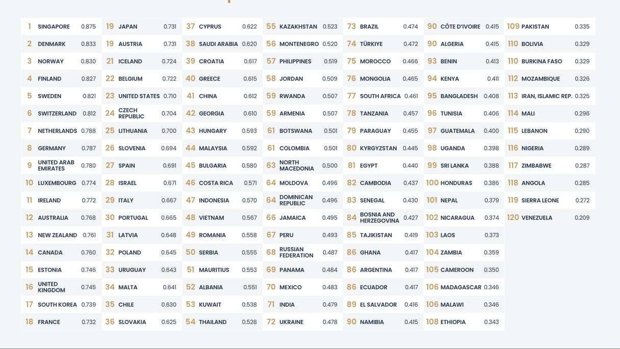 وتتصدر سنغافورة ترتيب الدول الأكثر كفاءة من حيث الحوكمة بمعدل 0,875، تليها الدنمارك (0,833)، ثم النرويج (0,830)، ففنلندا (0,827) والسويد (0,821).