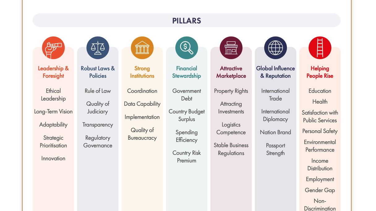 وقد شمل هذا التقييم 120 حكومة، جرى تقييمها بناءً على 35 مؤشرًا فرعيًا متساوي الأهمية، موزعة على سبعة محاور رئيسية: القيادة والرؤية الاستراتيجية، القوانين والسياسات المتينة، المؤسسات القوية، الرقابة المالية، الأسواق الجذابة، التأثير والسمعة الدولية، وتمكين المواطنين من الارتقاء.