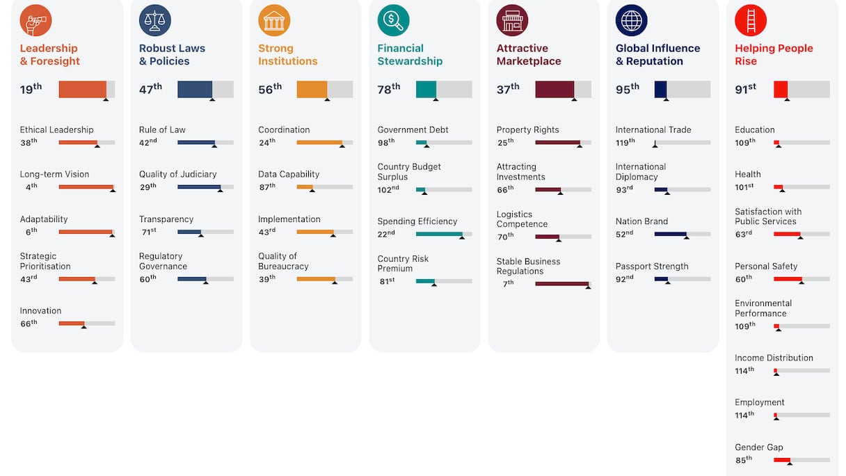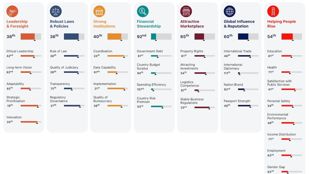 ويُعزى هذا التقدم إلى أدائها الجيد في ركائز «القوانين والسياسات المتينة» (المرتبة 36)، و«القيادة والرؤية الاستراتيجية» (38)، و«المؤسسات القوية» (40). غير أن موريشيوس مطالبة ببذل المزيد من الجهد في مجال «الرقابة المالية»، حيث جاءت في المرتبة 92.