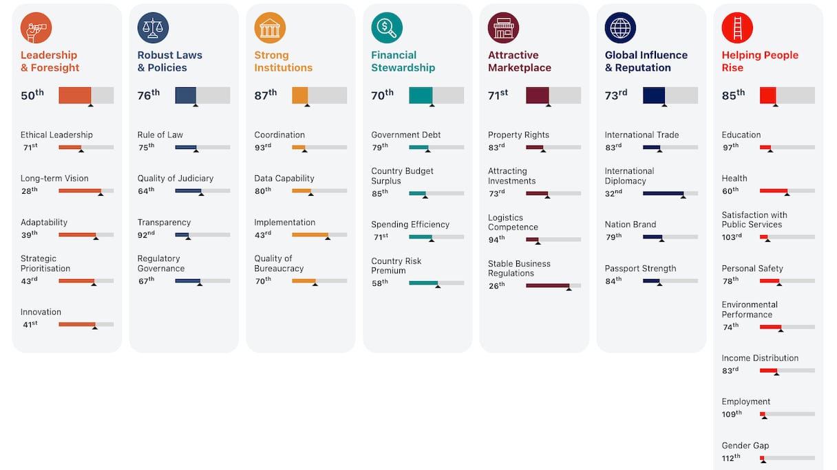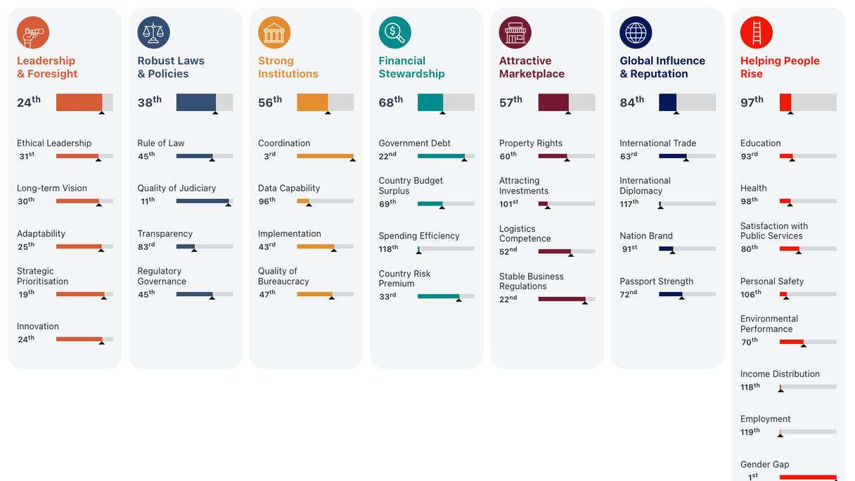 ويقيس هذا المؤشر أداء الحكومات ويحلل قدراتها المؤسساتية، التي تُعتبر ضرورية لضمان استدامة الأداء الجيد، بغض النظر عن توجهاتها السياسية.