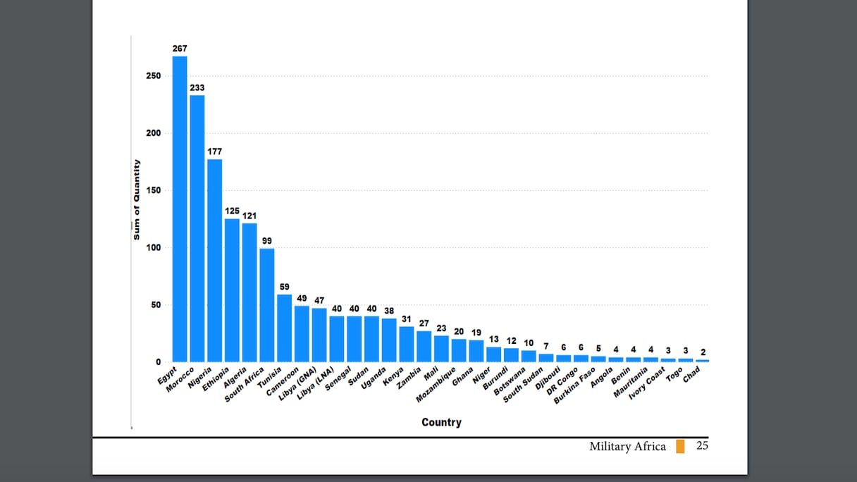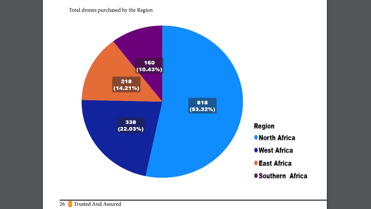وتمتلك الدول الخمس الأولى 60% (914 وحدة) من المسيرات العسكرية في القارة، وهو ما يؤكد وجود تركيز كبيرة لهذه الأجهزة في عدد قليل من البلدان.