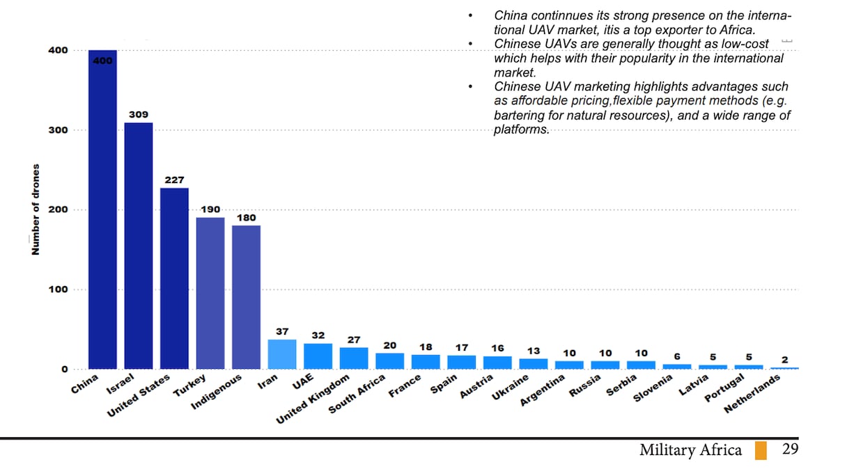ومع ذلك، في السنوات الأخيرة، تعتبر الطائرات التركية بدون طيار، ولا سيما طائرة بيرقدار تي بي 2 متعددة الاستخدامات، الخيار الأفضل من قبل العديد من البلدان في القارة الأفريقية التي تواجه مشاكل انعدام الأمن. أما إسرائيل، فقد زودت العديد من الدول الإفريقية بالطائرات بدون طيار، وعلى رأسها المغرب. ويتعلق الأمر بشكل عام بطائرات بدون طيار تكتيكية تساعد الجنود على معرفة تحركات قوات العدو في ساحة المعركة.