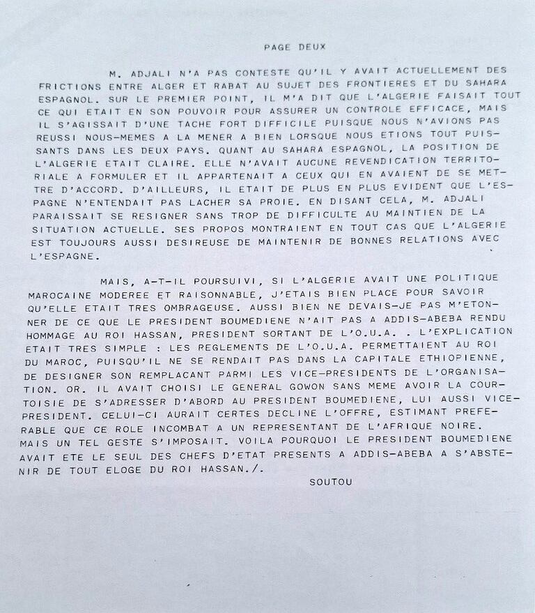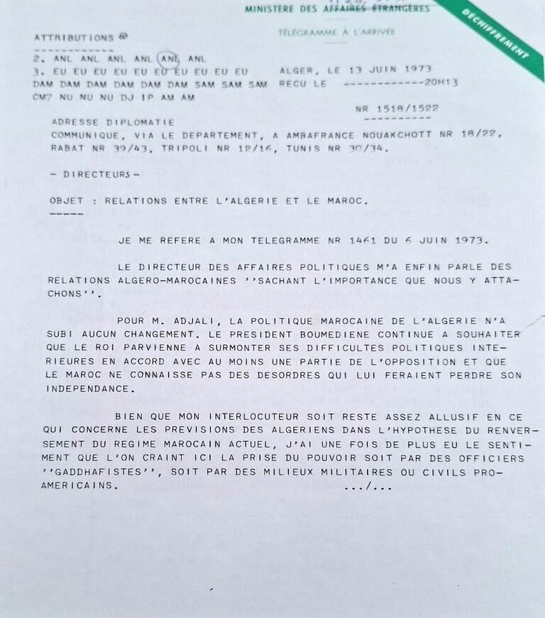 1: وثيقة أرسلها السفير الفرنسي جون ماري سوتو من الجزائر بتاريخ 13 يونيو 1973، بعنوان: «العلاقات بين الجزائر والمغرب» إلى مختلف السفارات في المغرب الكبير. أرشيف لاكورنوف، شمال إفريقيا، المغرب، الجزائر، موريتانيا، 1972-1982، تحت رقم: «2046INVA»، صندوق 897.