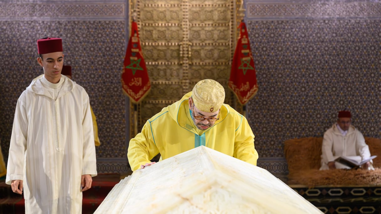 الملك محمد السادس، برفقة ولي العهد مولاي الحسن، أمام ضريح الملك الراحل محمد الخامس، يوم 28 فبراير 2026. DRISS BENMALEK