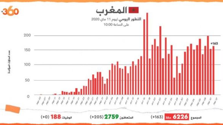 وأضافت الوزارة، على بوابتها الرسمية الخاصة بفيروس كورونا المستجد بالمغرب "www.covidmaroc.ma"، أن عدد الحالات التي تماثلت للشفاء من المرض حتى الآن ارتفع إلى 2759 حالة، بعد تماثل 205 حالات جديدة للشفاء، فيما استقر عدد حالات الوفاة في 188 حالة.
