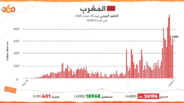 وأوضح منسق المركز الوطني لعمليات طوارئ الصحة العامة بوزارة الصحة، معاد لمرابط، في تصريح صحافي، أن الحصيلة الجديدة رفعت العدد الإجمالي لحالات الإصابة المؤكدة بالمملكة إلى 26 ألف و196 حالة منذ الإعلان عن أول حالة في 2 مارس الماضي، ومجموع حالات الشفاء التام إلى 18 ألفا و968 حالة بنسبة تعاف تناهز 72.4 في المائة، فيما ارتفع عدد الوفيات إلى 401 حالة.